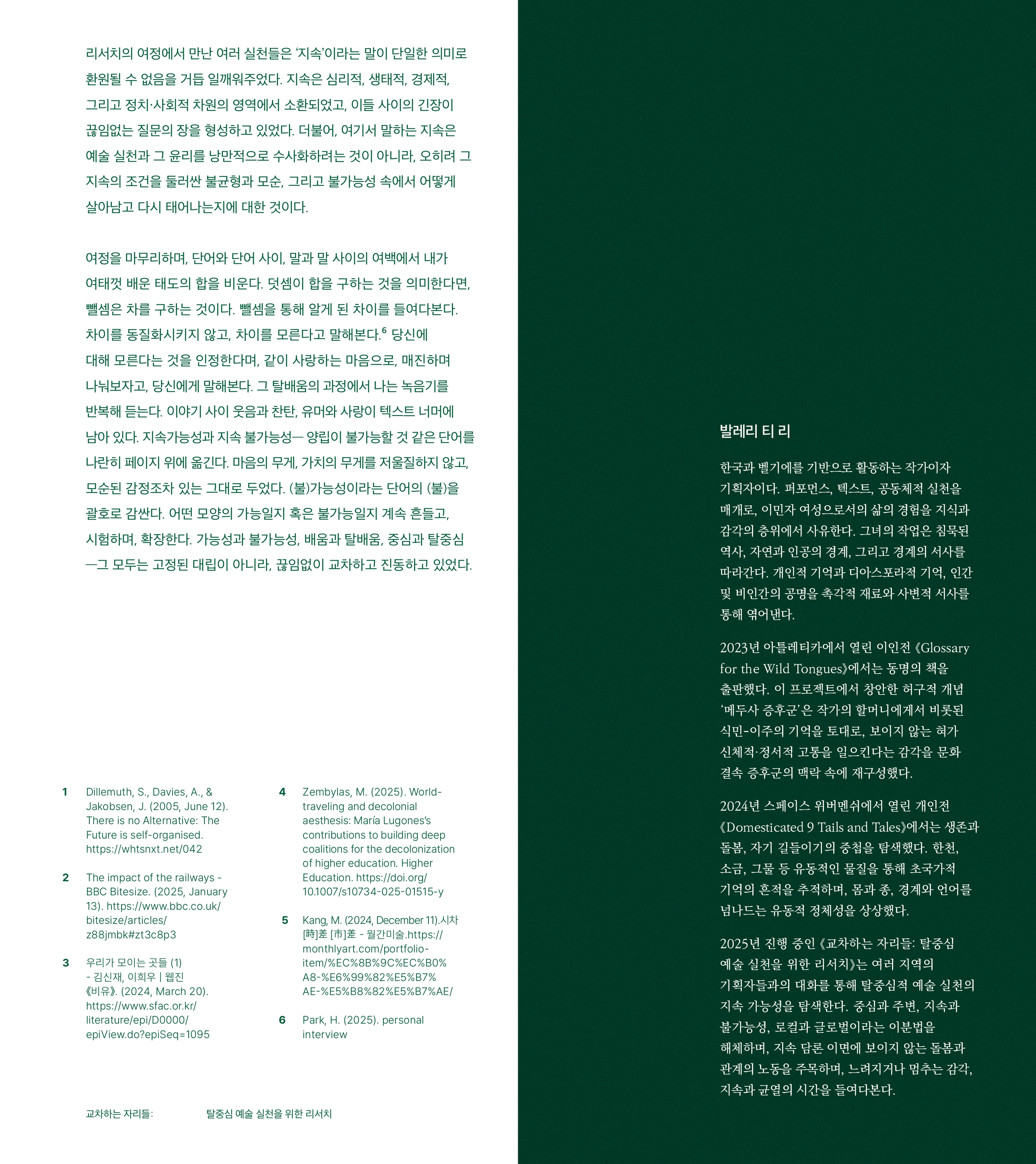 《교차하는 자리들: 탈중심 예술 실천을 위한 리서치》 중앙성에 균열을 내고, 주변부에서 발생하는 예술적 실천의 가능성을 탐색하는 연구·대화·현장 기록을 모은 책입니다. 작가는 국내외 여러 지역의 예술가, 기획자, 연구자들과의 인터뷰를 통해 ‘지역성’, ‘경계’, ‘이동성’이 예술의 언어와 방법론을 어떻게 확장하는지를 살펴봅니다. 이 책은 서로 다른 자리에서 활동하는 기획자들의 경험을 교차시키며, 중심-주변이라는 이분법을 넘어서는 새로운 창작과 사유의 토대를 제안합니다.