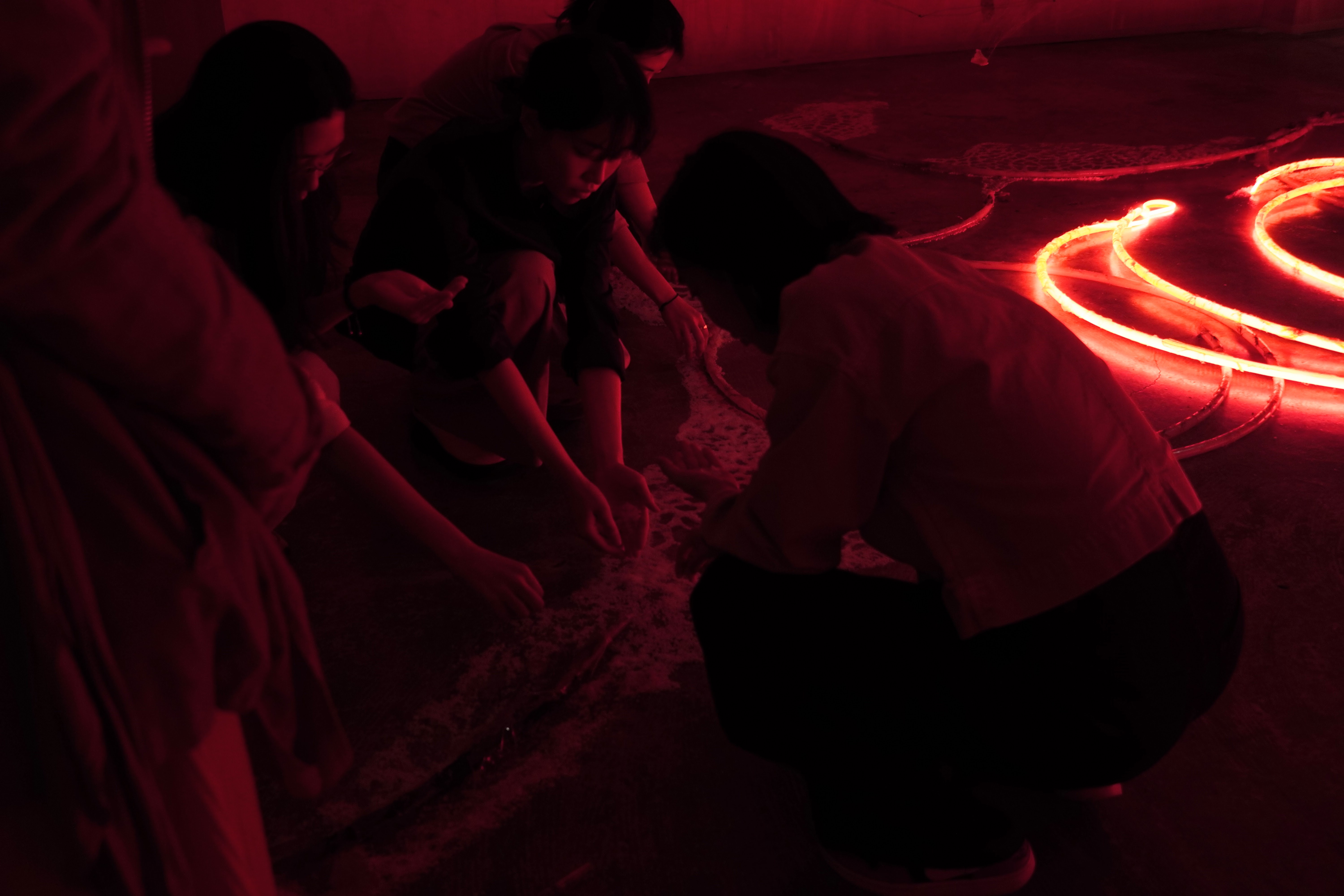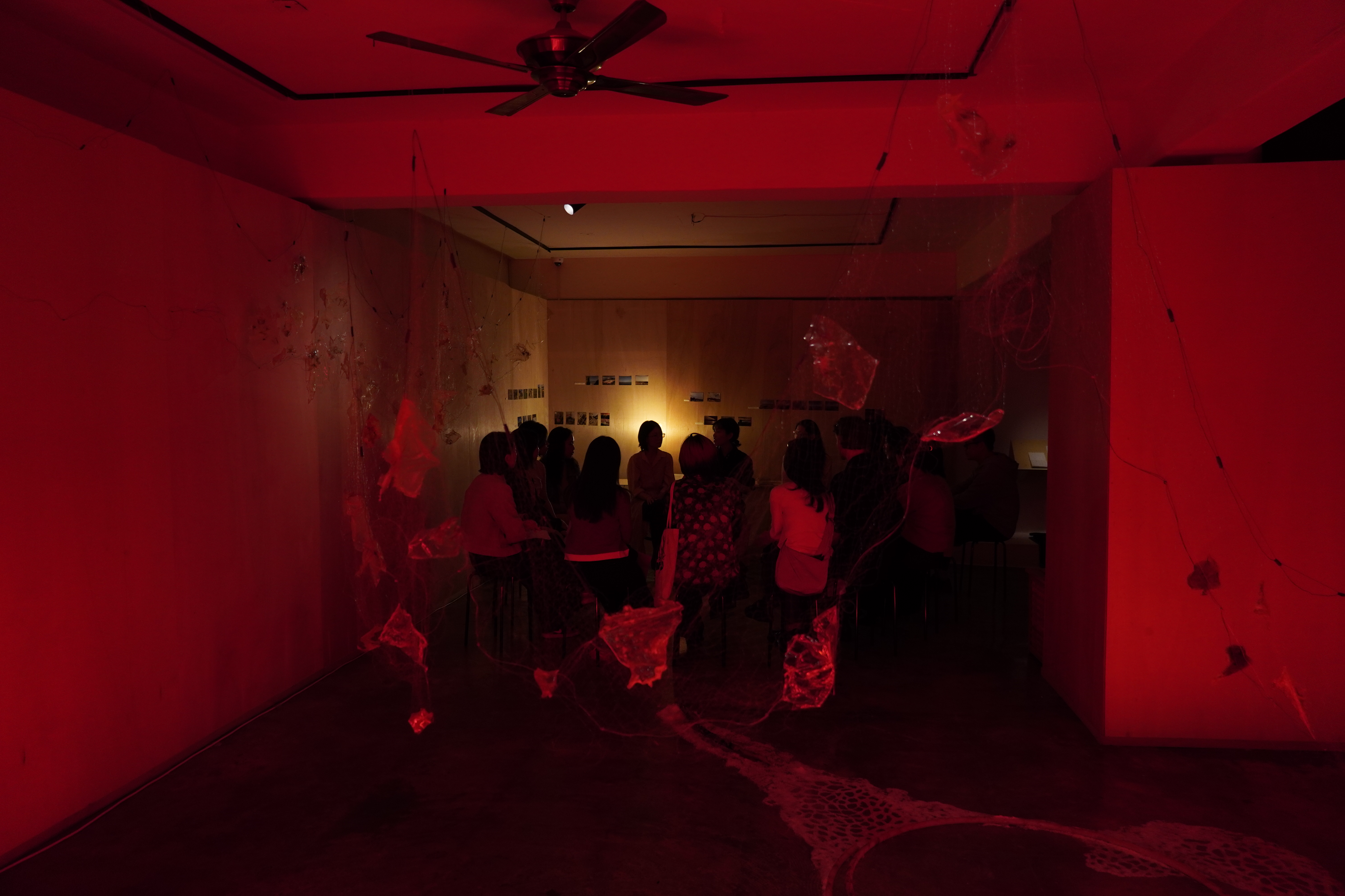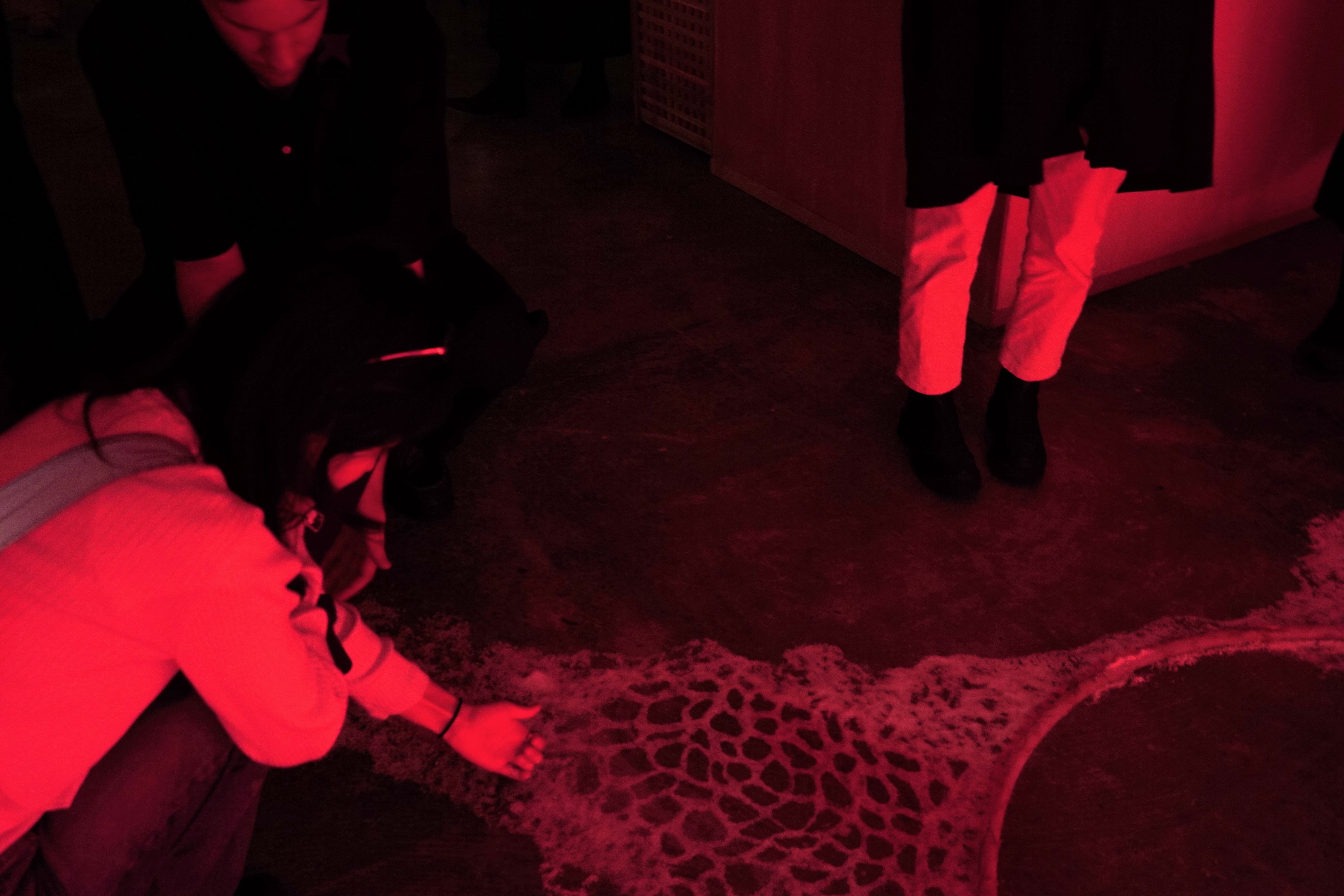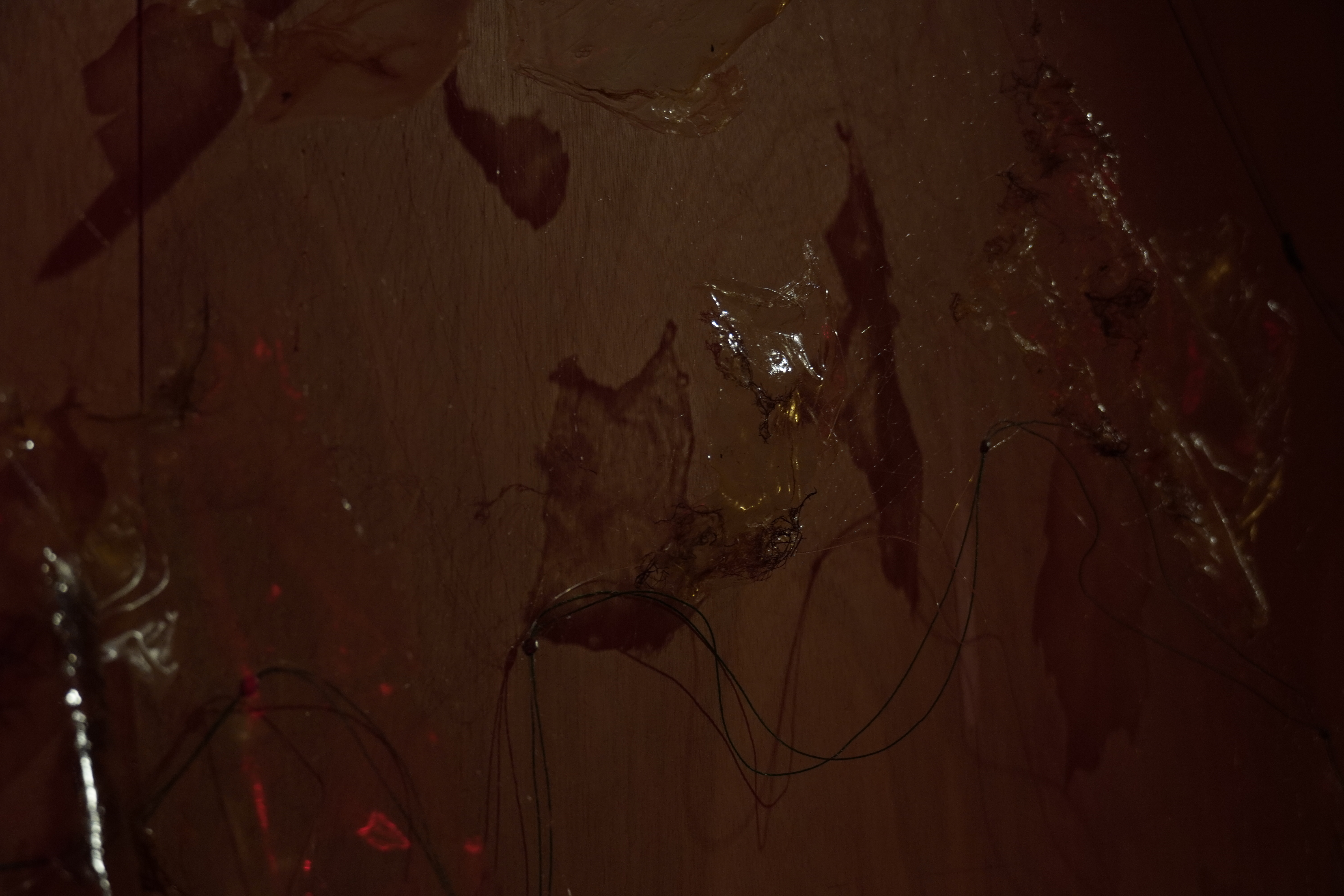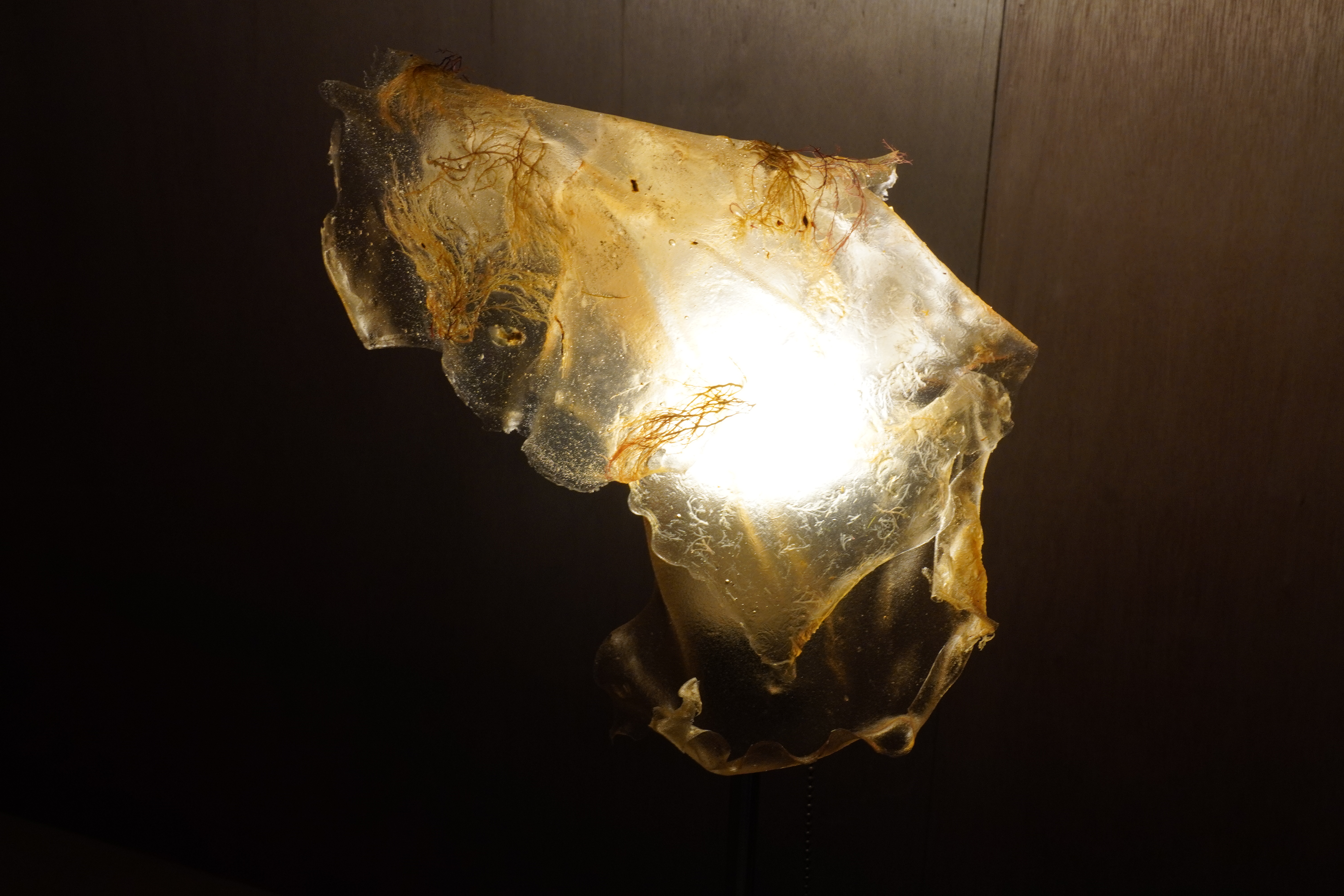 Red agar and agar bleached by natural exposure, salt, water, agar powder, gelatin powder, glycerin, food coloring, silk thread, red LED strip lights, recycled plastic tubes